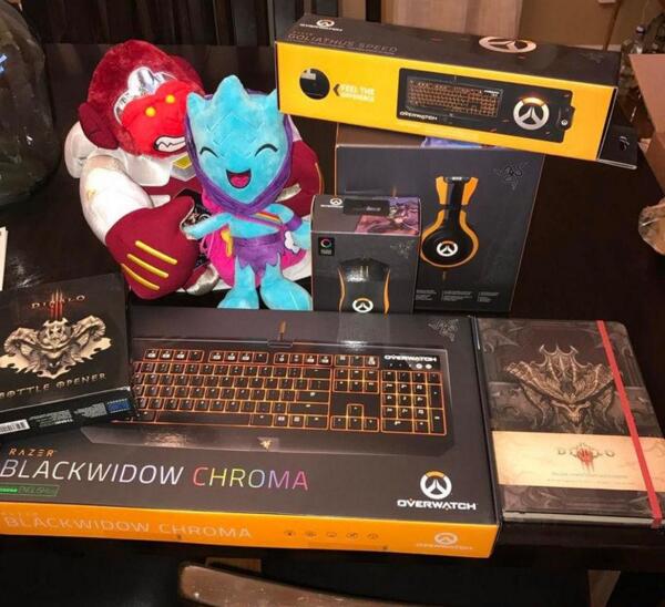 至少这张照片里就出镜了两个毛绒玩具、一个《暗黑破坏神》开瓶器,一整套Razer的《守望先锋》键鼠耳机套装(黑寡妇炫光版键盘、炼狱蝰蛇炫光版鼠标、战神耳机和重装甲虫鼠标垫)、《凯恩之书》,价格不菲。