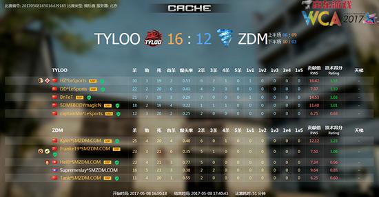 本轮比赛最后一张地图来到cache,ZDM在赢下刀局的情况下选择进攻方开局,随后就是一波RUSHB瞬间秒杀tyloo三名防守队员,但进攻过于顺畅的ZDM压到了警家,被HZ和BnTeT联手刷了个屏,两人来到跳台点杀包点的警察之后HZ再次击杀B通道的最后一名CT,巨大优势化为泡影。但随后tyloo的顶防没有起到很好的效果,ZDM放缓了进攻节奏之后一直压制着tyloo,随后的爆弹A区也是凭借kylin的狙击枪一度打开局面,选择进攻方的ZDM显然是想把节奏掌握在自己手中,上半场9:6领先tyloo。