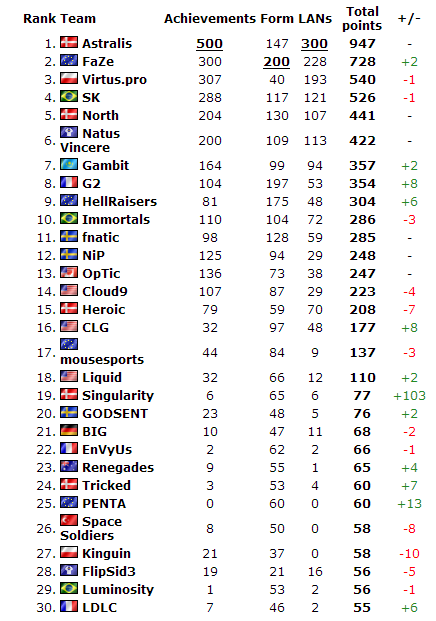 不知不觉中四月已经结束了,专业排名计算网站EGB.com也统计出了最新的全球排名。4月初,FaZe赢得了SLi联赛第三赛季总决赛的冠军,而VP、NIP、SK等队伍状态低迷。但第一名还是Astralis,丹麦人以947分的高分稳坐钓鱼台,超过排名第二的FaZe219分,超过排名第三的VP407分,而且他们在四月只参加了一次线下大赛。