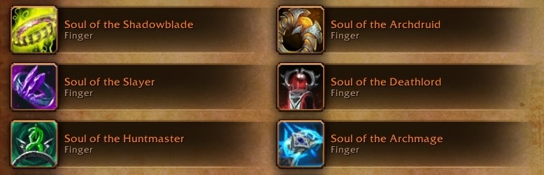 均为橙装戒指,特效类似,均为获得一个额外的本专精的天赋(作用机制应该和暗黑3的地狱火项链类似,佩戴后对应的天赋就是激活状态,但是你如果本身也点了对应天赋,对不起不叠加,只有一个能生效,意味着你对应层的天赋可以解放出来点其他2个)。