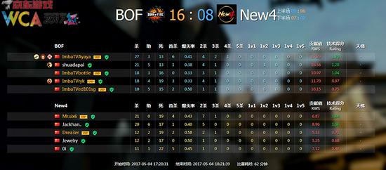下半场BOF如法炮制同样RUSH低坡,但没能及时清理高坡的Oi也埋下了伏笔,进到包点之后Oi的位置太舒服了,BOF再回去包的时候CT已经回防到位,New4手枪局先拿下!随后BOF也是因为下了两局C4全枪全弹,而New4同样没有换枪,但外场的枪械劣势让New4尝到了省钱的败果,自此之后New4再没拿过一分,BOF气势如虹,内外场的同步进攻做的十分到位,ayaya在最后一局中大胆绕后成功残血拿下1V2的残局!