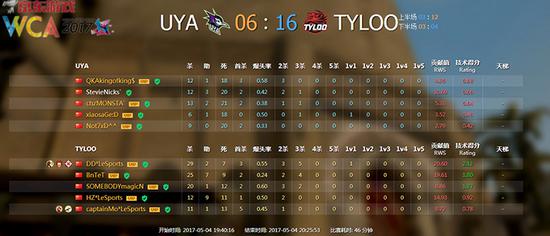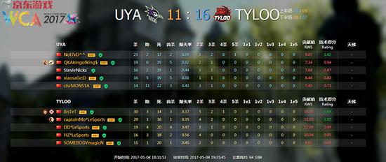 手枪局UYA快速进攻中路,被Mo两颗子弹秒杀两人之后再被HZ一换二,剩下的爱猪在A长廊被三人包夹束手就擒。经济局UYA选择强起配弹,烟雾封了跳台和B门之后23夹A,xiaosaGe和爱猪的TEC9火力全开,成功翻盘!可UYA面对Tyloo的ECO不该掉以轻心,B通道一颗瞬闪UMP连刷2个,Tyloo也翻盘成功后再起双狙连拿两分把UYA打入ECO。关键局Mo在B区的三杀拿下赛点后UYA经济吃紧,进攻B区无果后打出GG。