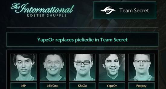 Secret战队在基辅特锦赛后正式宣布换人,Johan ‘pieliedie’ Åström离队,Yazied ‘YapzOr’ Jaradat将会加盟顶替其位置。