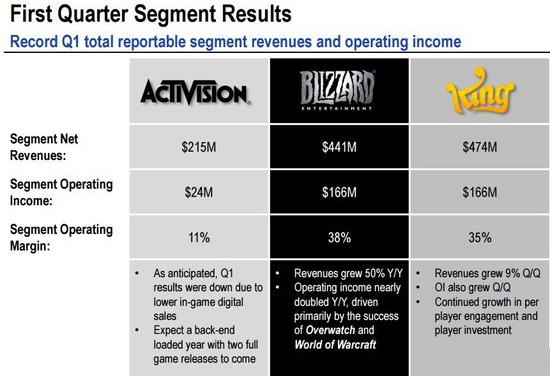 此外,动视暴雪还公布了第一季度三大分部门的相关财报,其中暴雪收入占比达38%。当然除了守望先锋,风暴2.0和炉石新拓展包“勇闯安戈洛”也为暴雪带来了极为可观的活跃与收入。据悉,动视第一季度月活跃用户达4800万,暴雪月活跃用户则达到了4100万。