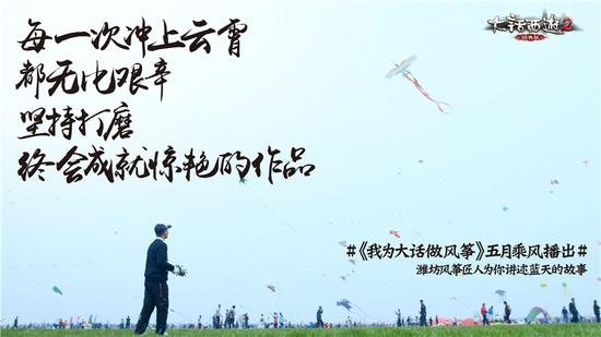 5月11日,《大话西游2经典版》第七坐骑上天纪录片《我为大话做风筝》即将首播,从扎制到放飞,每一个精彩的瞬间都将呈现你的眼前!传统的风筝工艺遇上唯美的云鹤形象,在李松师傅的手中,历经半个月的精心打磨,“削、扎、糊、绘”等多道工序步步到位,处处用心,每个细节都被高度还原。如此这般,待到一朝放飞直上云霄,方能展现云鹤展翼齐霞、出入云雾间的绰绰神姿、婷婷仙骨。