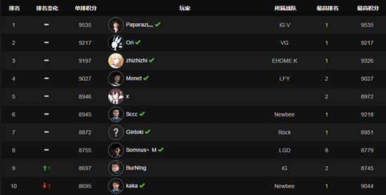 近日,中国战队iG.V一号位选手:Paparazi灬(拒绝者)成为了全球首个突破9500分的玩家。虽然iG.V战队近期比赛成绩不太理想,但似乎并没有影响到拒绝者冲分,也希望拒绝者的这次突破能帮助iG.V走出困境。