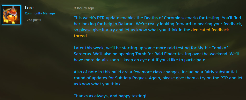 这周的PTR更新将开放克罗米之死场景战役的测试!你会发现克罗米正在达拉然寻求帮助。我们也喜欢听到你们对此的反馈,所有去玩一玩,然后在专用反馈贴里告诉我们吧。