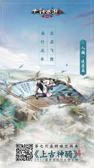 《大话西游2经典版》2017夏季资料片《上古神骑》推出首只飞行坐骑,凌虚扇、腾龙、云鹤、引魂鸟唯美登场,扶摇直上翱翔九天,战力升级三界同行!