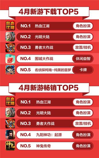 今日,360游戏正式发布2017年4月手游报告。虽然4月份整个中国手游市场上线的新品数量不及3月,但涌现出了不少精品,给榜单带来了全新的变化。从整体榜单看,网游畅销榜依然是老产品的天下,但可喜的是迎来了新面孔《热血江湖》。同时,网游下载榜也出现了两款堪称精品大作的MMORPG新游《热血江湖》与《光明大陆》,而新游里还有一款值得关注的黑马产品《勇者大作战》,其出色表现让放置挂机手游这个沉寂已久的小众游戏品类重新成为行业关注的焦点。