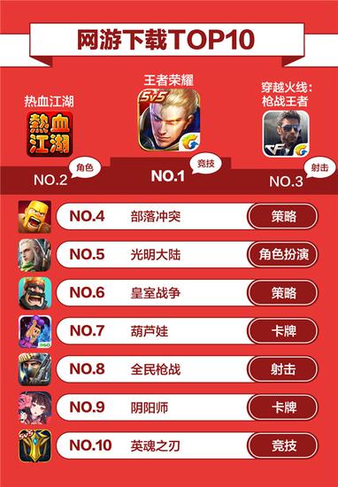 在下载榜方面,腾讯的王牌产品《王者荣耀》与《穿越火线:枪战王者》依靠其巨大的品牌知名度吸引各年龄层玩家下载,分列冠军与季军,而最值得关注的是《热血江湖》与《光明大陆》这两款新产品闯入网游下载榜前列,其中《热血江湖》获得亚军,《光明大陆》排名第五,这两者正是依靠精品大作脱颖而出,当然《热血江湖》还有IP的助力。