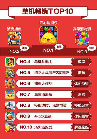 单机畅销榜中,消除类产品依然是广大休闲玩家的最爱,《开心消消乐》、《宾果消消消》与《海滨消消乐》占据了TOP10里的3个名额,分列第一、第三与第七。同时,捕鱼类游戏也表现不俗,《波克捕鱼》与《捕鱼大作战》各自取得了第二与第六的成绩,尤其是《波克捕鱼》以其在线捕鱼的独特玩法,带来了不同于以往单机类捕鱼游戏的社交与竞技的全新体验,加上其持续不断的版本更新,吸引了广大的热爱“捕鱼”类游戏的玩家,进而从众多单机产品中脱颖而出,直逼休闲霸主《开心消消乐》,证明了休闲游戏引入在线社交机制,突破纯单机玩法局限后产生的收入潜力。而另一款在核心玩法上与捕鱼游戏反其道而行之,主打“养鱼+社交”模式的益智休闲游戏《开心水族箱》则保持在第九的位置。
