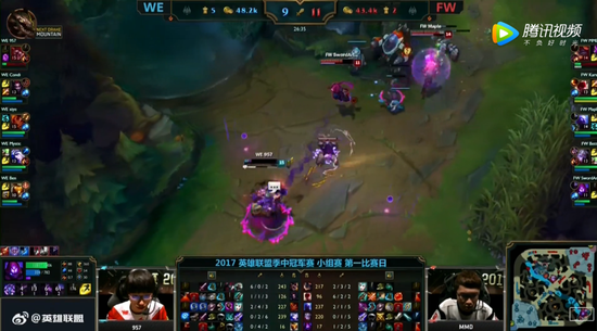 小组赛首日第二局WE对阵FW,全场走势与两队风格有着相当程度上的契合——WE在前期取得一定优势的情况下遭到FW的疯狂反击,而最终LPL冠军凭借全队的共同努力,以及957在本场当中的出色发挥瓦解了对手迅猛的攻势,在游戏后期,957面对对方三人围剿,成功逃脱,拖延时间帮助队伍拿下大龙,锁定胜局。
