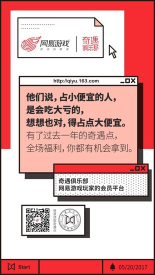 过去一年投入游戏所积累的积分将全部返还据了解,网易游戏将投资10亿为玩家采购福利,并联合了众多跨界合作品牌,为玩家提供种类繁多的实物商品和特权,而玩家无需任何额外花费,即可凭在游戏中消耗的时间和金钱所转化的奇遇点获得。同时,玩家只要持续投入游戏,奇遇点还将持续上涨。