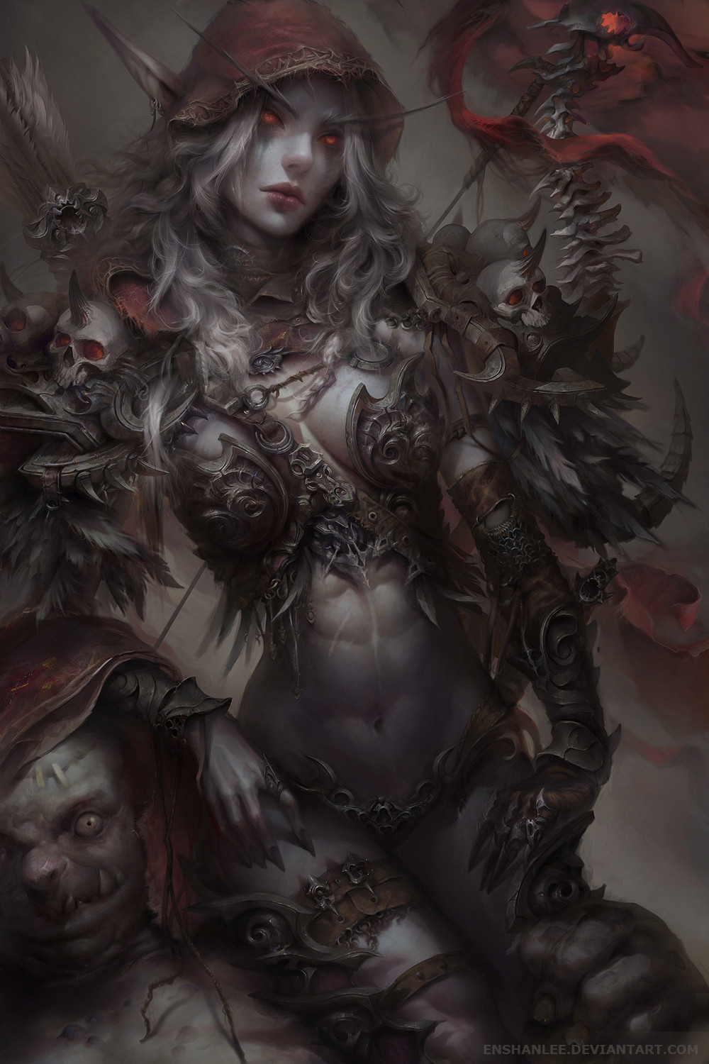 分享一张国外玩家ENSHANLEE绘制的魔兽世界同人图,希尔瓦娜斯与憎恶。绘画风格非常细腻,整张画的色调也非常舒服。