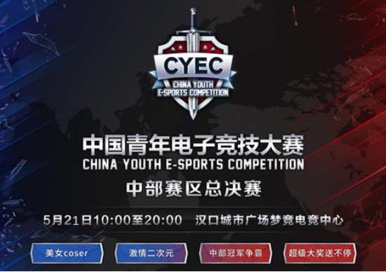 2017年5月21日,中国青年电子竞技大赛(以下简称CYEC)中部赛区总决赛即将打响。经过前期小组赛的层层选拔,来自各大高校的战队现场比拼,多支电竞战队脱颖而出!产生了包括英雄联盟、刀塔2、守望先锋、王者荣耀4个电竞项目的前四强和炉石传说前八强。