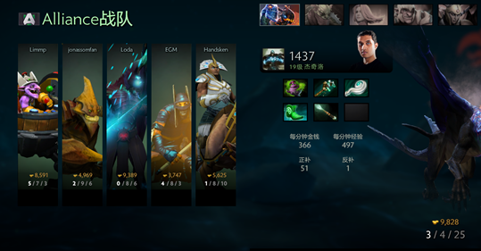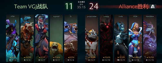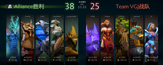 决胜局,开局VGJ继续抢符拿下冰女一血,而中路跟发条补足魂的影魔则是被蓝胖打的痛不欲生,线上VGJ略占优势。十五分钟做出跳刀的大鱼人扛起了局面,Alliance在大鱼的带领下成功反扑,扳回局势,占据主动。二十八分钟带盾影魔上路逼近高地,VGJ奋力反抗无济于事,上路告破。随后巨大的经济差距使得VGJ毫无反击之力,下路高地成为了A队的舞台,巨魔交出买活阵亡后VGJ打出GG,Alliance让一追二成功晋级。