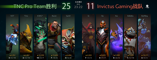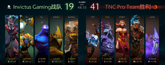 次局TNC再次首选双头龙,而iG显然还未找到破解的办法,随后iG选出Op绝活TK,但TNC也对中路进行了重点照顾,经济惨淡的TK难以在中期发挥应有的作用。而iG唯一一个节奏点SK也迟迟没有打到跳刀。20分整谜团剑圣TK为了秒一个带盾巨魔交掉了所有技能,TNC顺势开团,再次打出一波1换4。此后iG进入艰难的高地攻防战,虽然守高颇有成效但却容不得任何失误,而TNC也没有给iG太多机会,最终TNC 2:0拿下比赛。