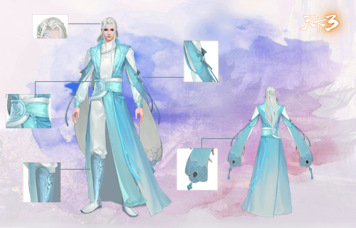 男装以一袭修长的月白锦袍,搭配以蓝色的立领装饰,腰系一条蓝色冰晶腰带,显得更加的高雅飘逸。衣服上还点缀有宛如冰晶一般的精细刺绣,两袖之外更是以晶莹剔透的蓝色小玉珠相连,平添了几分潇洒和自如。
