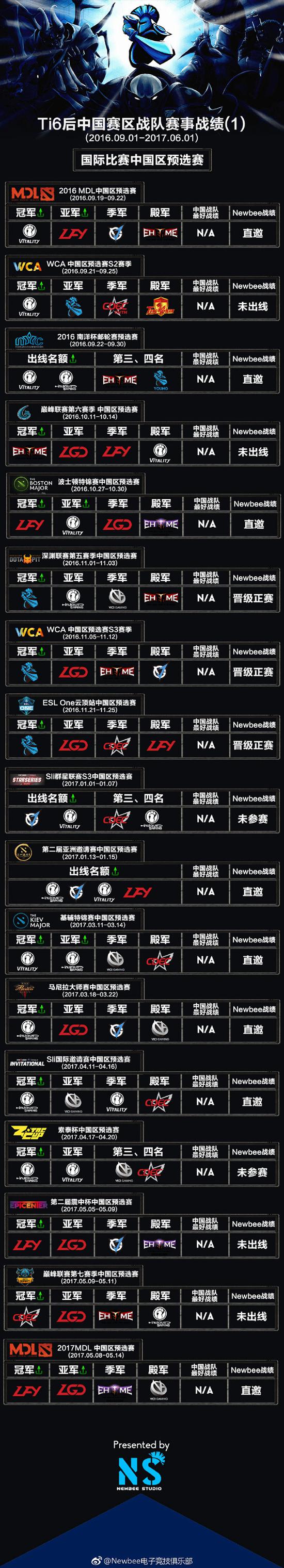从这份中国区预选赛统计来看,我们可以发现一个非常有趣的现象。后TI6时代的中国战队没有出现某只战队制霸中国的现象,反而有点轮流坐庄的意思。比如2016年9月的三个预选赛都由iG.V获得冠军,2016年11月三个预选赛冠军由Newbee获得,2017年3、4月iG战队获得三个预选赛冠军,2017年5月LGD战队获得三个预选赛亚军。。。