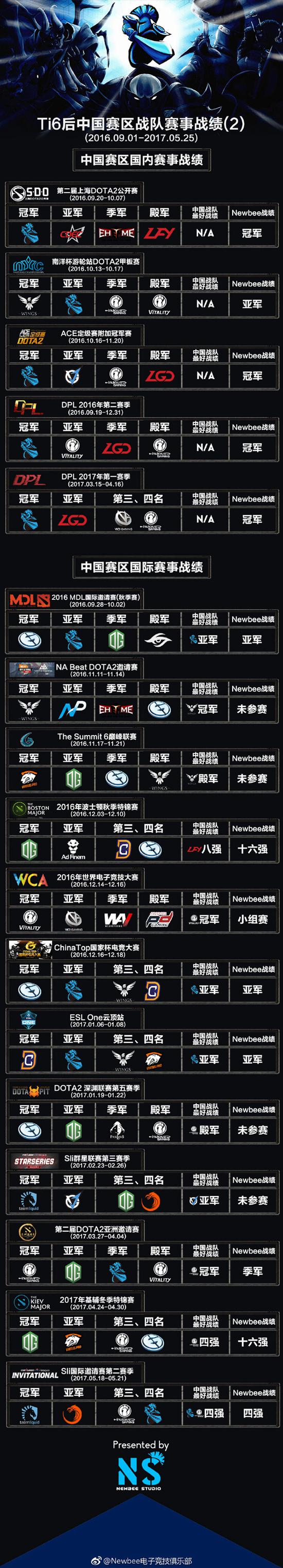 DOTA2自中国战队Wings在TI6上斩获冠军后已经过去大半年了,眼看还有两个月时间就要进入TI7,Newbee俱乐部官博整理了一份后TI6时代DOTA2比赛中国战队成绩统计。