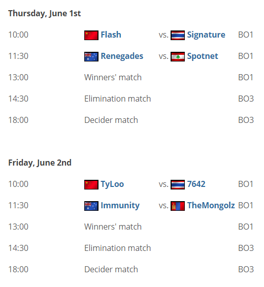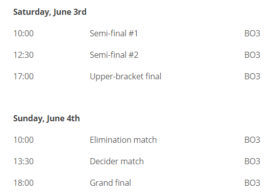 淘汰赛将会在6月3-4日举行,赛制为BO3双败淘汰赛。