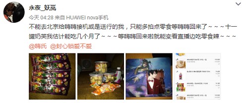 除了告白、考古、关心等一些真爱粉之外。还有直接贡献自己力量的粉丝,直接拍好零食耐心等待嗨氏开播,来报辣条可好?