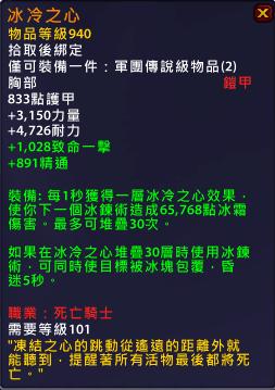 因为有第10条中所提到的bug,现在冰胸在ptr是一件非常非常变态的橙装,特效dps估计不低于25万。如果各位看到某萨墓测试视频,发现某dk打得很高,不用怀疑,他带着胸。