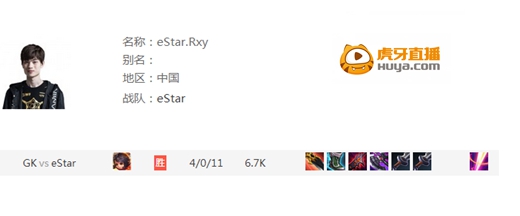 eStar、Rxy,前期Rxy出的贪婪之噬打野刀,接着是移动的抵抗之靴增加移动速度和法术防御,攻击型装备是末世加暗影战斧。前期仅仅两分半将经济差拉到两千。随后,李元芳推塔、清野、控龙、拿主宰一气呵成,将GK打的毫无招架之力,10分钟拿下比赛。