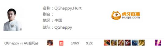 QGhappy、Hurt,在对阵WF的比赛中,Hurt在次局拿到李元芳开始首秀,并且运用到下路常规对线,在面对AG超玩会时破天荒拿出打野型李元芳,最终以5-0-9的成绩战胜了对手,他的出装包括打野刀贪婪之噬,移动是疾步之靴,