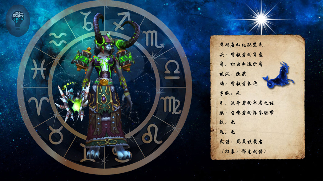 Key部件:羊角帽;我早期幻化之一,以mop绝版的术士挑战套为主,被拉壮丁来填坑。