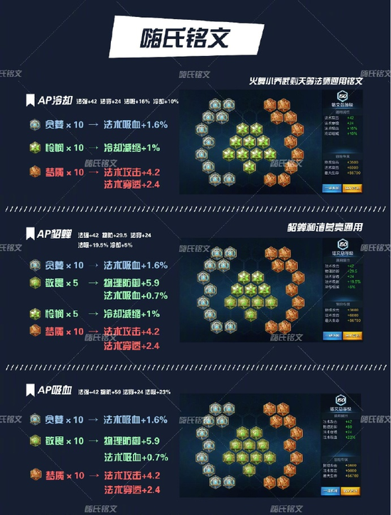 AP系列铭文搭配,唯一区别则是法术吸血和冷却缩减之间的冲突。两者可以自己权衡,配貂蝉这样的高吸血英雄当然是在控好蓝BUFF情况下,吸血能力越强越好。