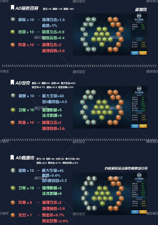 这三个铭文除了第一个是虞姬专属铭文AD隐匿百穿外,剩下的AD坦克铭文选择就多了。有像白起程咬金这样吃移速坦克,也有恢复型坦克。具体如何搭配就可以仔细选择了。