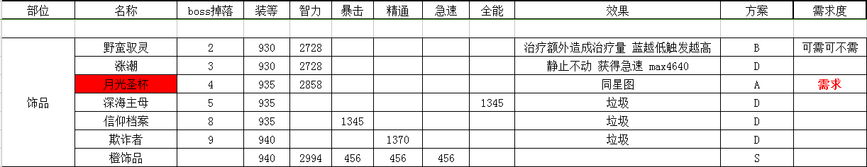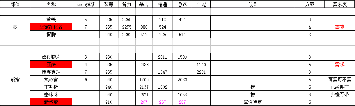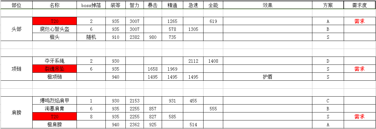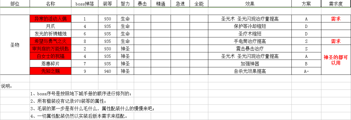 所有的装备都是从地下城手册进行统计和归纳,没有算上大秘境的装备以及赌博装备,并且部分对于raid本提升不是很大的橙装,这里也没有做具体的分析和归纳,希望各位聚聚们可以网开一面,因为不考虑到每个人都属于欧皇,如果有欧皇做到随便开940的当然可以完全无视这个需求优先级。