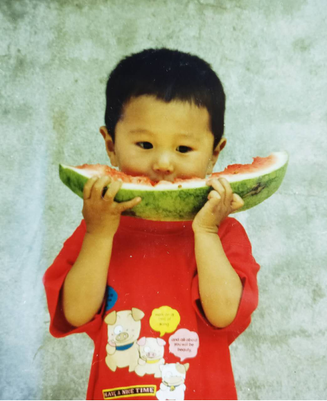 从小就爱吃大西瓜,难怪外号叫大西瓜!衣服上三只小猪也是超口爱哦!好想捏捏脸!