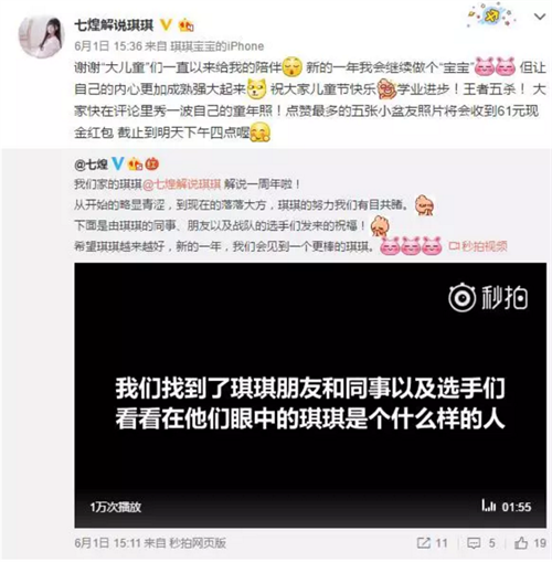 今日,琪琪出道一周年。七煌官方微博发布琪琪解说一周年公告,并带来了琪琪同事、朋友以及战队选手们录制的视频祝福。视频中Wefun.shadow、解说白乐、助理李凯、Estar。指尖、AG超玩会。梦泪、解说李九、解说兔牙以及闺蜜李子研等人,同事、朋友和选手们讲述了自己心中琪琪的印象,表达了对琪琪的祝福以及想说的的话,大家眼中的琪琪勤奋、活泼、努力的妹子,大家都希望琪琪越来越好。