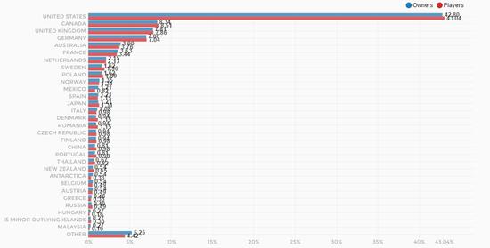 SteamSpy的数据显示,贡献销量最多的地区是美国,而因为游戏锁区的原因,所以并没有多少国区玩家买到这款游戏。不过,因为统计延迟的原因SteamSpy目前显示的销量数据并没有官方所公布的那么多。