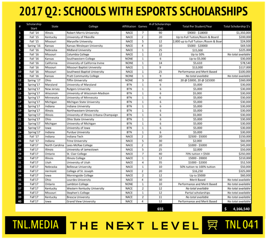 而作为北美地区设立电竞奖学金的先驱——罗伯特莫里斯大学,这所大学有90位学生能从电竞奖学金中受益,比其他所有大学都要多。而随着电竞项目逐渐被更多人所接受,TNL预计在不久的将来美国将会有共60所大学设立电竞奖学金。
