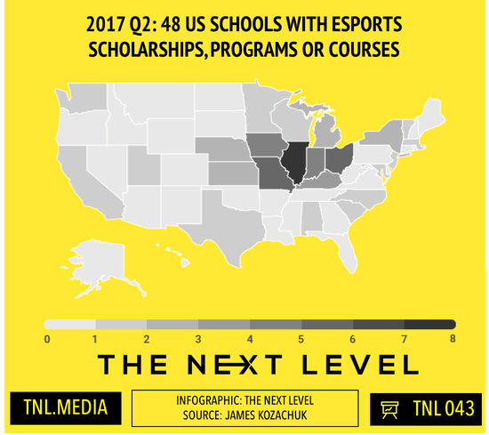 另外,美国现在已经有48所大学提供与电竞相关的奖学金、开设电竞相关的研究项目和课程。这些大学大多集中在美国中东部地区,五大湖附近。