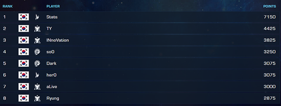 这四位选手在IEM11赛季中屡获佳绩,比如TY在IEM11卡托维兹世界总决赛成功登顶,INnoVation在IEM11京畿道站的比赛中斩获冠军。同时在当前WCS韩国赛区最新积分榜中,Stats、TY、INnoVation、soO四人分别位居前四,主办方经过考虑后最终给予了他们本次上海站的种子名额。