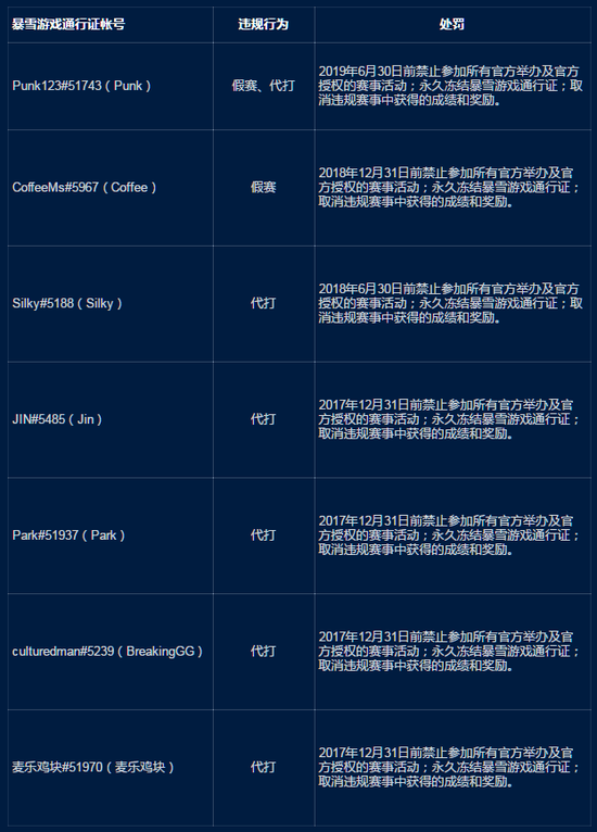 根据《星际争霸II》黄金职业联赛选手手册中的规定,经过细致调查并获得处罚依据之后,赛事组委会决定对部分于官方及官方授权赛事活动中参与代打、假赛行为的选手依违规情节进行处罚。