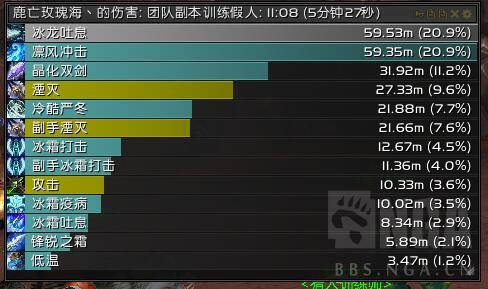 最后呢,我个人还是对这个SIMC模拟的结果表示可以作为依据,因为我自己去打了一下木桩伤害分布呢和SIMC跑出来的基本一致,由于我没装战斗时间插件,所以战斗时间被拉长了一点导致龙喷的占比稍稍低了一些,以及我个人比较菜所以冷酷严冬占比稍稍低了一些。
