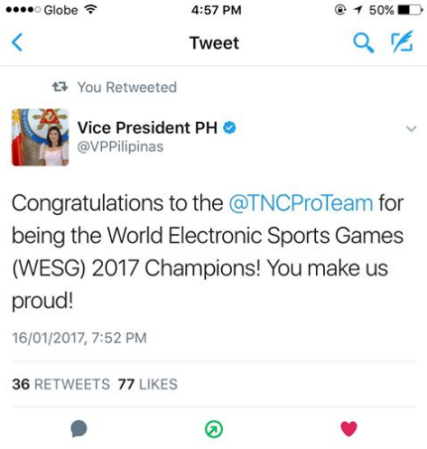 同中国一样,菲律宾的电竞爱好者也希望主流社会能逐渐接纳这项运动,因此副总统Leni Robredo的这条祝贺他们在WESG夺冠的推文在全国引起了巨大的反响,一时间全社会都掀起了一股发展电竞的热潮,后来TNC的队员在机场收获的欢呼声甚至不输给奥运冠军,这与玩什么游戏无关,与80W美刀的奖金无关,只因他们坚持不懈,只因他们国而战。