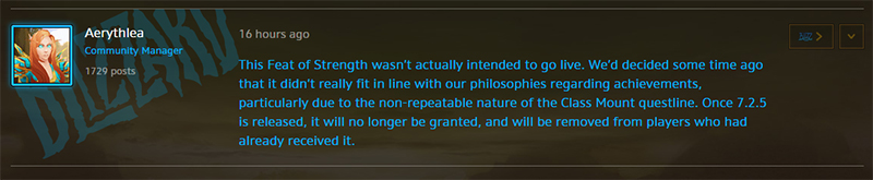 A:这个光辉事迹事实上并不会继续存在。我们之前已经确定,它并不符合我们对于成就的设计哲学,特别是由于职业坐骑任务线不可重复的性质。当7.2.5上线,它就不再能被获得,并将从已经获得的玩家那里移除。