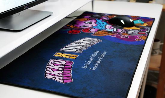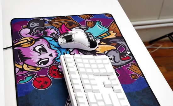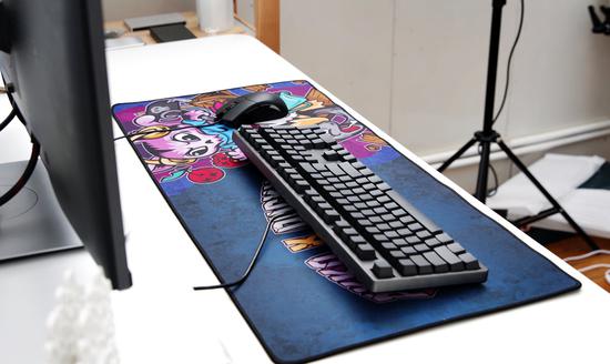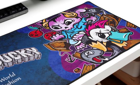 鼠标垫整体选择以青色为底色,右边使用了猫鸭大战的插画,左侧加入了Akko和Ducky的联合Logo,以及双方的Slogan,“Switch the world”以及“Touch the fashion”,鼠标垫采用了750*350*3mm的桌垫尺寸,佳积布材质保证顺滑,细致锁边,延长寿命。