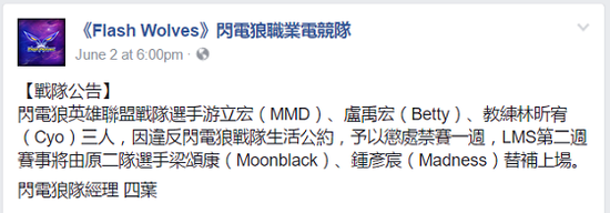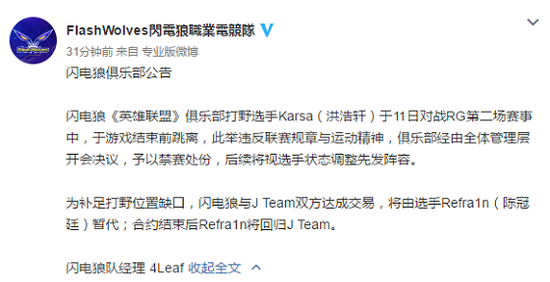 6月12日,LMS赛区战队闪电狼(Flash Wolves)管理层宣布禁赛队内核心Karsa,并从J Team租借入打野Refra1n临时顶替出场。这也是这两周闪电狼针对队内纪律问题开出的第二张罚单。