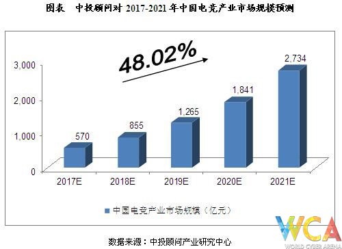 兴业的兴趣不仅吸引了更多的参与者,资本也在瞄向这块市场,力图在行业发展中占领优先市场。2010年我国电竞市场规模仅为44.1亿元,到2015年则达到269.1亿元,6年间增幅达513.6%。2017年中国电竞产业市场规模将达到570亿元,预测未来五年均复合增长率约为48.02%,2021年中国电竞产业市场规模将达到2,734亿元。