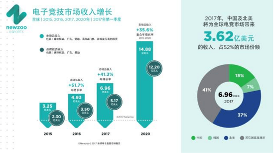 根据Newzoo对电竞市场的统计(主要是赛事及赛事的强相关内容,不包含电竞游戏收入):2017年全球电竞收入将达到12.20亿美元,相比去年增长35.6%,连续三年保持了较大幅度的增长。其中中国电竞市场收入3.62亿美元,占比15%,仅次于占比37%的北美。