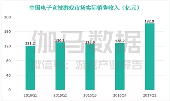 而在电竞游戏市场方面,据伽马数据的统计:2017年Q1国内电竞游戏市场收入达到182亿元,相比去年Q4的128亿元上涨42%。