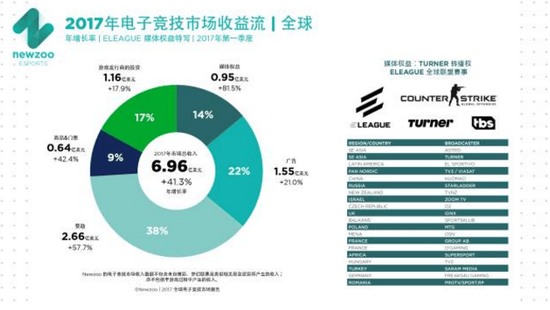 Newzoo的统计显示, 2017年全球电竞市场收益流当中赞助、广告分别占到了38%和22%。这其实仍是近似于传统体育产业偏保守的盈利模式。