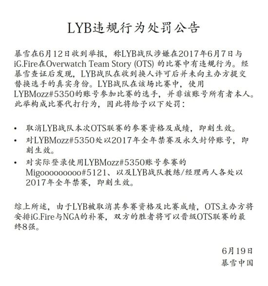 在6月7日《守望先锋》OTS联赛iG.Fire对阵LYB战队的较量中,LYB战队在收到换人许可后未向主办方提交替换选手的真实身份,在6月12日暴雪收到了举报,经查证后LYB战队的选手LYBMozz#5350的账号并非本人使用,因此暴雪官方判明LYB战队违规,今天官方也是发布了处罚公告,一起来了解一下。